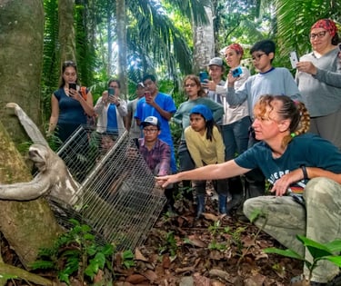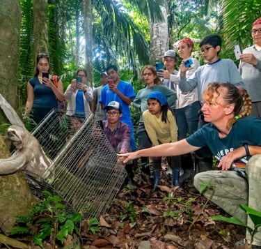 Our second day begins with a hearty breakfast at 6:30am. From 7:00am to 8:40am, we'll assist our resident ornithologist in studying and identifying local bird species. This hands-on experience includes capturing birds using mist nets, collecting data, photographing, banding, and releasing them back into the wild. At 9:00am, we'll join the scientific team to review and study camera trap footage, uncovering the presence of jaguars, pumas, anteaters, and other local wildlife. We'll also check Pitfall traps used to study frogs, small mammals, and invertebrates. By 11:00am, we'll return to the rescue center for a midday break.
