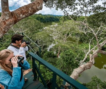 Experiences: trail walks, lake visits, canopy tower, and macaw clay lick.